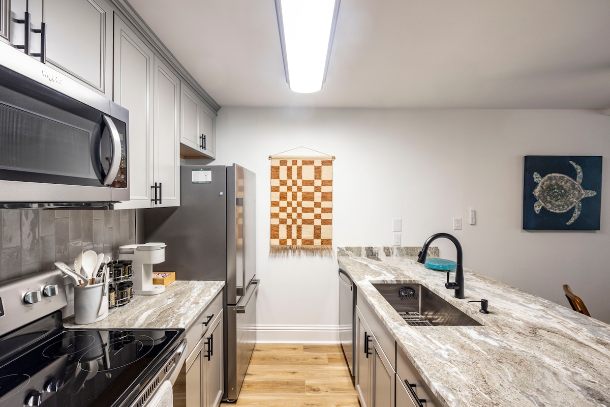 If you are interested in a great little getaway, this is it. Gated UPDATED BEACHY condo with private gated parking & pool. IDEAL LOCATION. Walk/Bike to the Beach, Pier Village Shopping, Restaurants & Entertainment. Custom made book with local recommendations included. Condo is setup similarly to a hotel suite with Kitchenette *see photos. Relaxing jetted tub&large shower Has washer/dryer, full refrigerator, Keurig coffee, WiFi, Roku Stick, Alexa, Amazon Music, Amazon Prime, Netflix.