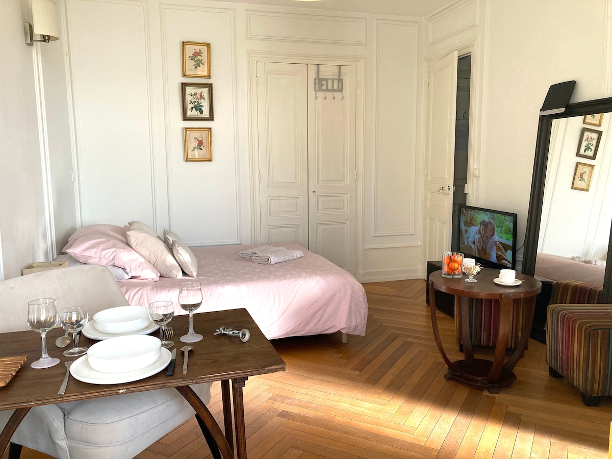 Բարի գալուստ մեր բնակարան, որը գտնվում է նախկին Վիլլա Վիկտորիա պալատում: Ընկղմվեք Aix les Bains քաղաքի գեղեցիկ ժամանակի մթնոլորտում ՝ վայելելով այսօրվա ժամանակակից հարմարավետությունը (հեռուստացույց, մանրաթելային Wi - Fi...) Բնակարանն ամբողջությամբ վերանորոգվել է ՝ պահպանելով իր ժամանակաշրջանի տարրերը, ինչպիսիք են մանրահատակները, ձուլվածքները և մարմարե բուխարին, ինչը հմայք և նրբագեղություն է հաղորդում: