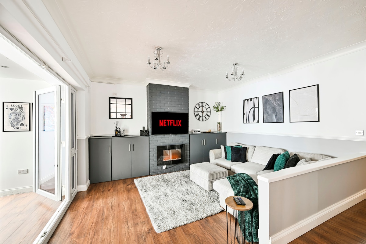 Բարի գալուստ այս ժամանակակից, շքեղ, 4 ննջասենյականոց տուն, որը նախատեսված է այն ընտանիքների և խմբերի համար, որոնք փնտրում են ընդարձակ տարածք, հարմարավետություն և հարմարություն։ Վայելեք ընդարձակ հյուրասենյակը, որտեղ կա 65 դյույմանոց սմարթ հեռուստացույց, Netflix և արագ Wi-Fi, որոնք իդեալական են քաղաքում անցկացրած օրվանից հետո հանգստանալու համար։ Տանը կա 2 king-size չափսի մահճակալ, 2 երկտեղանի մահճակալ, 3 լոգասենյակ, այդ թվում՝ մեկը՝ սենյակից անմիջապես մուտք ունեցող, և բաց հատակագծով լուսավոր խոհանոց և ճաշասենյակ։ Հյուրերը կարող են նաև օգտվել ճանապարհի վրա գտնվող կայանատեղիից (10 £/օր)։ Գտնվում է հարմար տեղում՝ Իստ Հեմի ավտոկայարանի, տեղական խանութների և սրճարանների մոտակայքում։