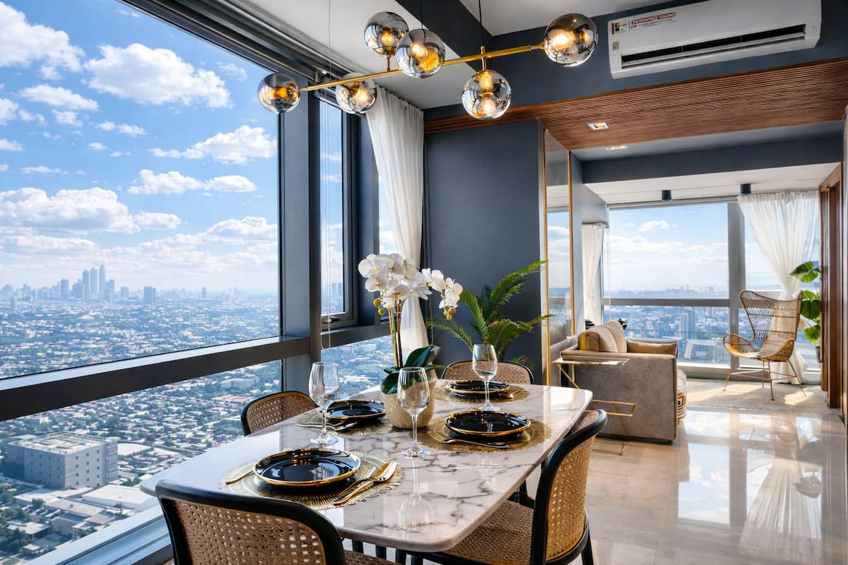 Բարի գալուստ մեր բոլորովին նոր, շքեղ անկյունային բնակարան, որտեղ ցերեկ-գիշեր բացվում է հիասքանչ համայնապատկերային տեսարան։ Գտնվում է Eastwood Global Plaza Luxury Residences-ում - Շուրջօրյա կոնդոմինիումային անվտանգություն - Հաճախորդների բացառիկ սպասարկում - 200 Մբիթ/վ Wi-Fi արագություն - Սմարթ հեռուստացույց ՝ Netflix - ով, Disney+- ով և Prime Video - ով - 5 րոպե մինչև Eastwood Mall – 35 րոպե մեքենայով մինչև օդանավակայան - Վերևից լիցքավորման լվացքի մեքենայով