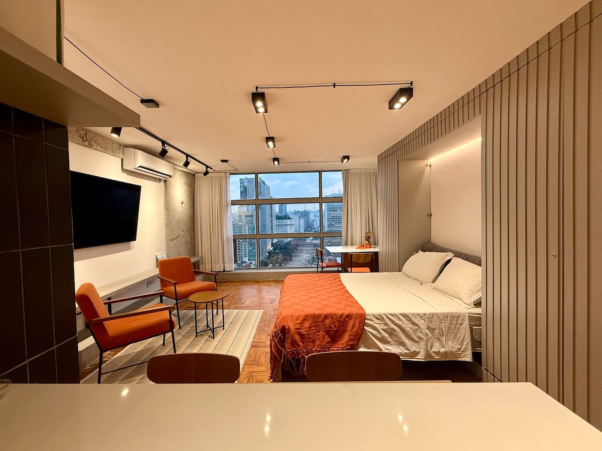 Estúdio espaçoso com muito design, arquitetura e a melhor vista de São Paulo. Loft completo! Com cama queen, closet, ar condicionado silencioso, cozinha completa, home office, WI-FI, TV 55” e uma belíssima banheira de imersão, de onde pode apreciar o seu drink preferido e curtir uma vista apaixonante. São Paulo toda estará há poucos minutos de você. Acesse o metrô andando apenas 200m. Reserve com tranquilidade! Proporcionaremos uma excelente hospedagem e uma ótima experiência!