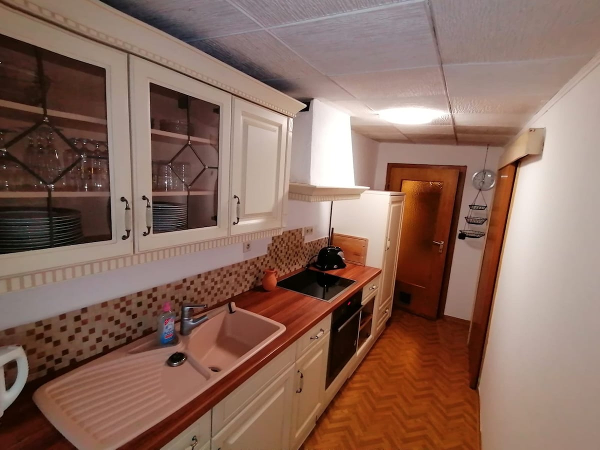 Բնակարան «Alte Schule Kail» Լուսավոր, հարմարավետ բնակարանը մոտ 75 քմ է և կարող է տեղավորել 3 - ից 6 մարդ: Այն համատեղում է ինքնատիպ և անկատար հմայքը ՝ ունենալով հարմարավետ մթնոլորտ ։ 2020 թվականին վերանորոգված ՝ մանրուքների նկատմամբ մեծ ուշադրությամբ և սկզբնական բնույթի զգացողությամբ, բնակարանը ոգեշնչում է իր նախնական փայտե հատակներով, փայտաշեն վառարանով և վերամշակված էկոլոգիական և ոչ թունավոր շինանյութերով ։ Ընտանիքի համար հարմար, աշխատանքային սեղան, W - LAN