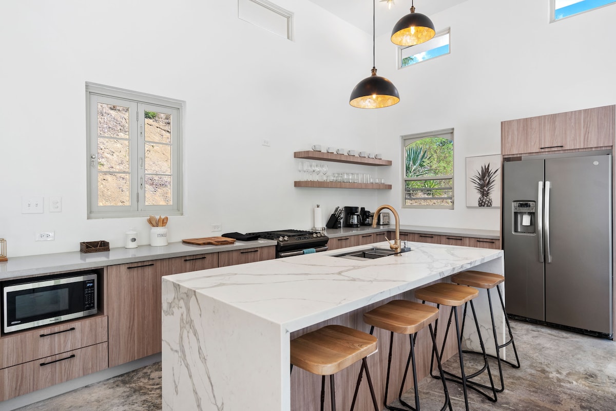New Residence in Puntas Neighborhood NOT a Container Home; High Ceilings and Open Concept Distribution Bohemian Decoration Surrounded by Nature Modern Eco-Conscious Design Parking Inside the Property Saltwater Pool King Bed TV/Surround System Fully Equipped Kitchen, Expresso Coffee Machine Full Capacity Backup Generator/Water Cisterns Almost one Acre to walk around; no direct neighbors 3 Minute Drive to the Beach Kids Friendly 3 Decks; Perfect for Leisure BBQ Area with Pool Side View