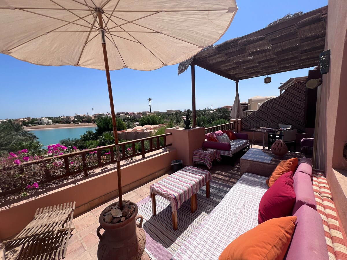 Cheerful spacious apartment sleeps up to 5 adults comfortably, located in Gouna only beachfront community MANGROOVY Access to 6 large swimming pools, 3 min walk to a long beach & centrally located between 3 Marinas Private access to 100m rooftop terrace furnished with cosy outdoor furniture overlooking huge pool. Sun deck is unique feature of this apartment Interior styling is homey to ensure relaxing vacation Important Note: 5 Adults (21+ years old) maximum are allowed. No limit on minors.