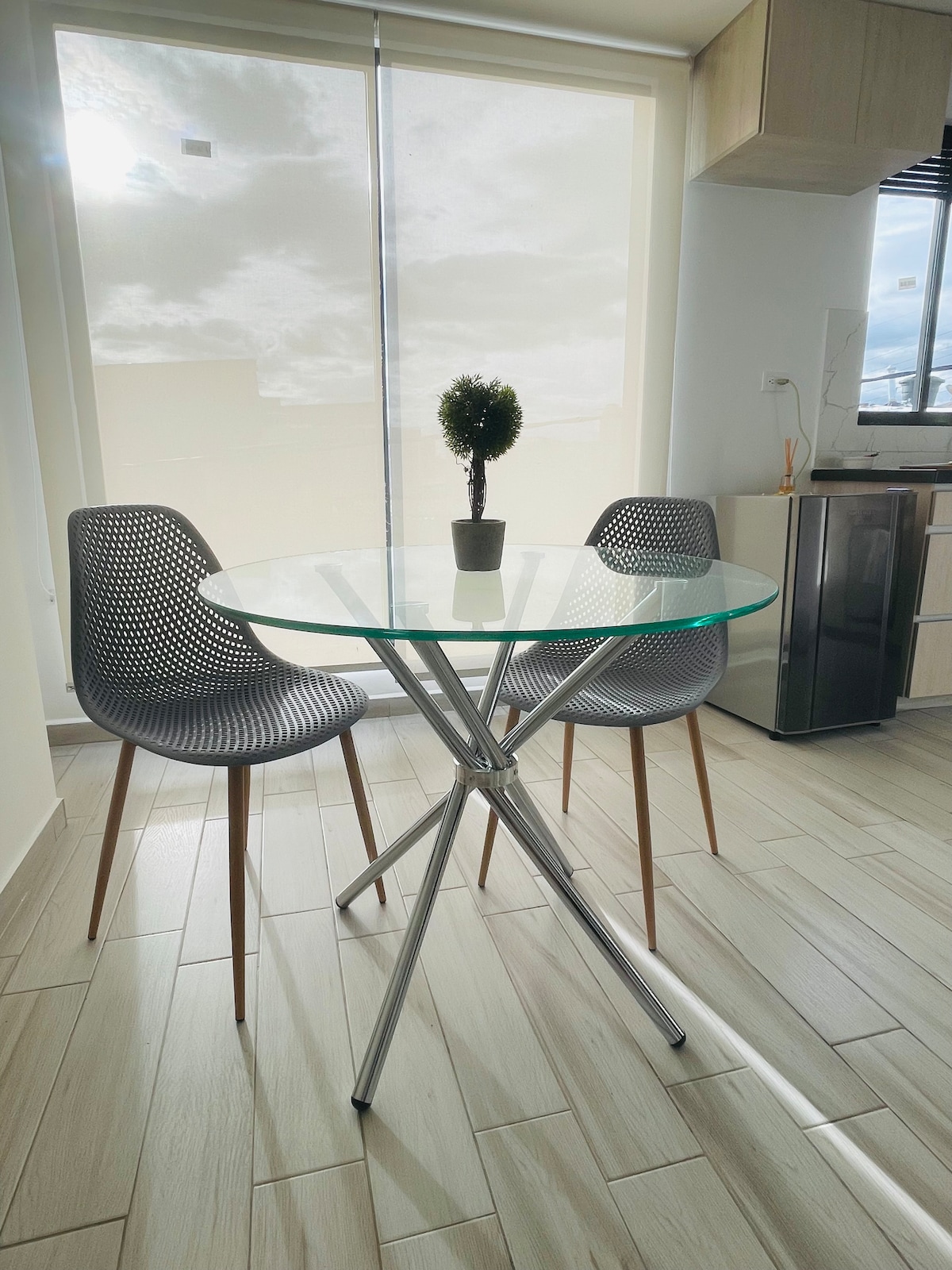 Ընդարձակ 60 մ2 մակերեսով բնակարանը, որը գտնվում է կենտրոնական Բոգոտայում, ունի տպավորիչ տեսարան դեպի քաղաքի արևելյան բլուրները ՝ օդանավակայանից ընդամենը 35 րոպե հեռավորության վրա, պատմական կենտրոնից 15 րոպե հեռավորության վրա, տարբեր առևտրի կենտրոններից (Mall Plaza, Plaza Central, Centro Mayor) 15 րոպե հեռավորության վրա, հասարակական տրանսպորտի մի քանի կայարանների մոտ: Կատարյալ է գործնական ուղևորությունների, զույգերի կամ մինչև 4 հոգանոց խմբերի համար ՝ լիովին կահավորված ։