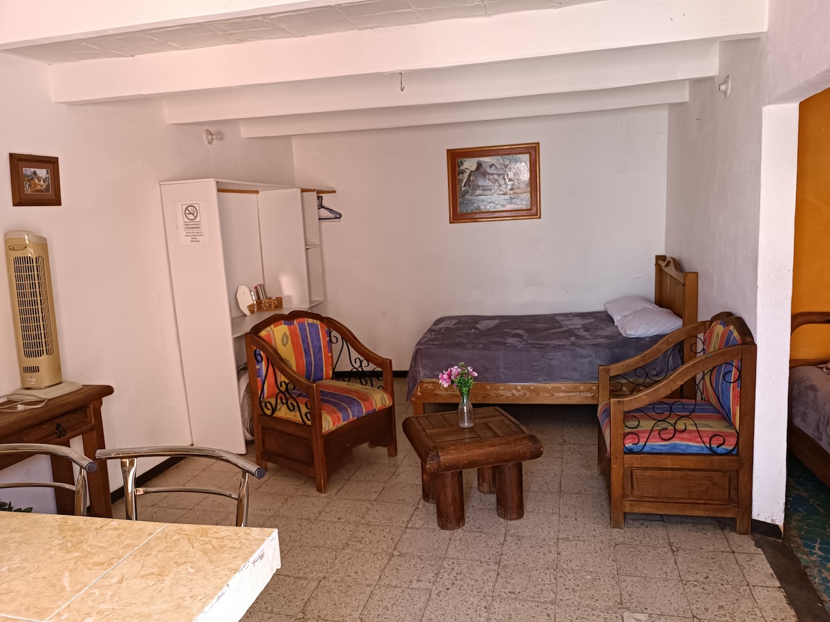 We invite you to experience comfort and privacy in our rustic-modern Studio! Integrated within an old mansion in the historic center of Querétaro, just a few blocks away from the cathedral and the historic Teatro de la República, our location is privileged in the heart of the city, in a peaceful area away from nighttime noise. Come and enjoy an unforgettable stay!