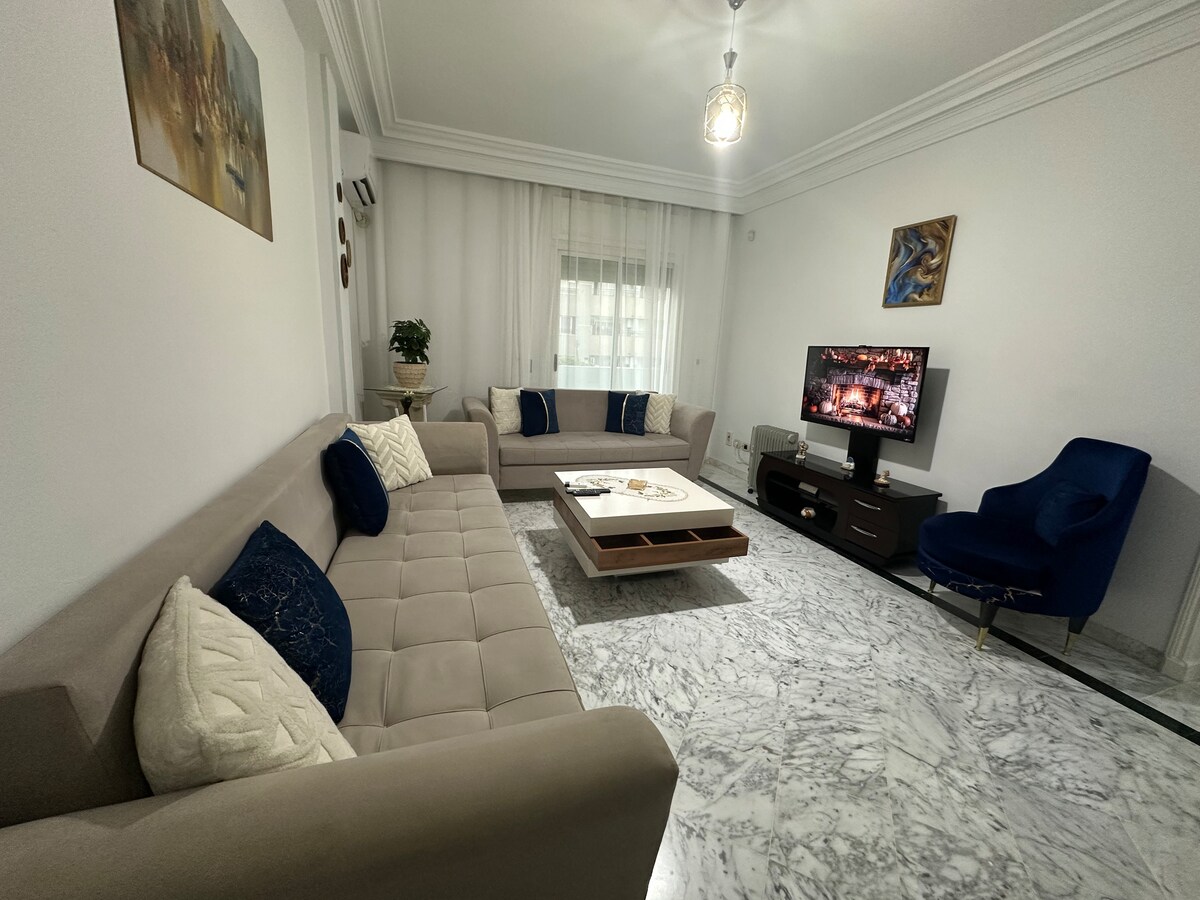 Գեղեցիկ վերանորոգված բնակարան օդանավակայանից 5 րոպե հեռավորության վրա ։ Լիովին հագեցած ննջասենյակով, հյուրասենյակով, բաց խոհանոցով, ժամանակակից լոգասենյակով և պատշգամբով, որտեղից բացվում են Հեդի Նուիրա պողոտայի տեսարանները ։ Wi - Fi, հեռուստացույց, միկրոալիքային վառարան, սառնարան, տաք ափսեներ և այլն ։ Ապահով բնակության վայր ՝ խնամողով, կոդավորված վերելակով և անվճար կայանատեղիով ։ Հարմարավետորեն գտնվում է խանութների, ռեստորանների և տրանսպորտի մոտակայքում ։ Հարմարավետություն և հարմարություններ Թունիսի սրտում ։