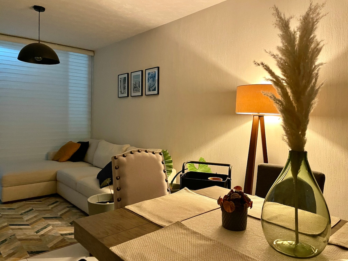 Bonito departamento con terraza en segunda planta con una cama King size, un sofá-cama y un sofá. Contamos con pantalla S-Mart TV para que puedas acceder a tus plataformas preferidas. El departamento se encuentra cerca de las avenidas principales de la ciudad, por lo que facilita el acceso al centro histórico, así como la movilidad al sur de la ciudad. Cuenta con cochera techada y portón eléctrico. Hay todo tipo de comercios a menos de 5 minutos caminando. ***Facturamos tu estancia***