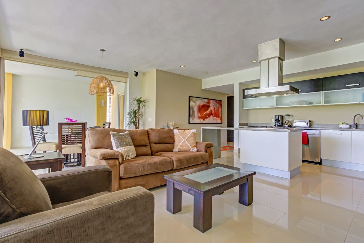 Վայելեք շքեղություն և հարմարավետություն Մարինա Վալյարտայի սրտում։ Այս բացառիկ բնակարանը, որը գտնվում է 7-րդ հարկում, առաջարկում է ֆունկցիոնալ և ժամանակակից փորձառություն՝ տարածաշրջանի լավագույն տեսարաններից մեկով։ Ձեր մասնավոր պատշգամբից կարող եք դիտել զբոսանավերը, նավահանգստի գիշերային լուսավորությունը, օդանավերի թռիչքները և Սիերրա Մադրեի վսեմ լեռները։ • Միասնական տարածքներ՝ Լուսավոր հյուրասենյակ՝ 65 դյույմ անկյունագծով սմարթ հեռուստացույցով, որը միանում է 193x203 սմ մահճակալով հագեցած գլխավոր ննջասենյակին