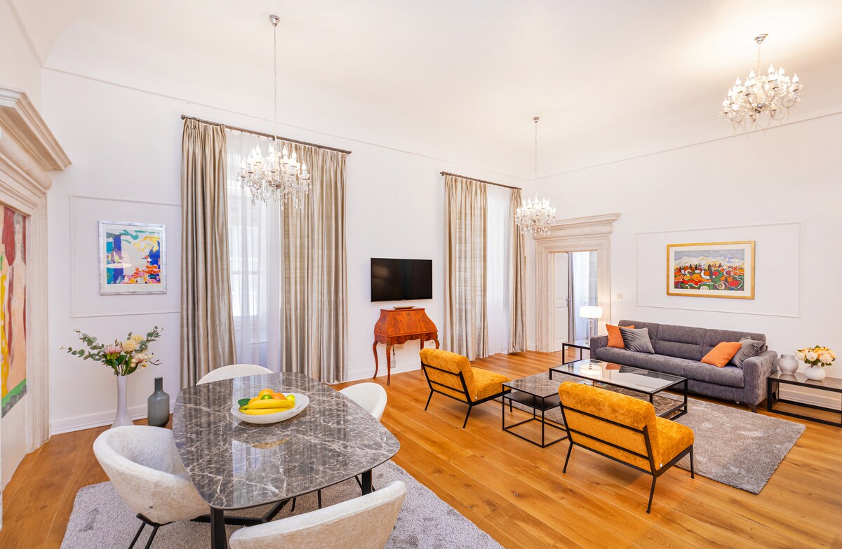 Այս ժամանակակից, ընդարձակ, լուսավոր և հարմարավետ բնակարանը գտնվում է Փլուզե անունով հայտնի քաղաքի ամենացանկալի հատվածում գտնվող ավանդական քարե տան առաջին հարկում: Նարնջագույն ծառերի այգի և առանձին տեռաս ՝ ճաշասենյակով, հյուրասրահով և արևայրուքով, որտեղից բացվում է հիասքանչ տեսարան դեպի Ադրիատիկ ծովը և Դուբրովնիկ Հին քաղաքը ։ Հին քաղաքից ընդամենը մի քանի րոպե հեռավորության վրա գտնվող բնակարանը հեռու է բանուկ փողոցներից և աղմուկից, որպեսզի լինի խաղաղության և հանգստության օազիսը ։