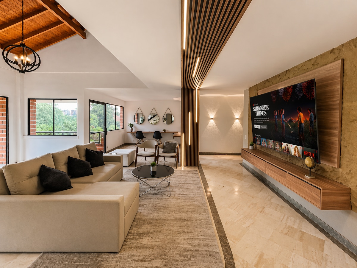 Luxury 70m² loft on the 9th floor of the iconic Energy Living. Open our floor-to-ceiling windows to transform your entire living space into an airy, open-air retreat with Medellin’s best skyline views. Features a King-size bed, two 80" TVs, and a sleek modern design. Enjoy a rooftop infinity pool, gym, and jacuzzi on the 22nd floor. Located 5 mins from Provenza and El Tesoro. Secure, quiet, and perfectly connected.