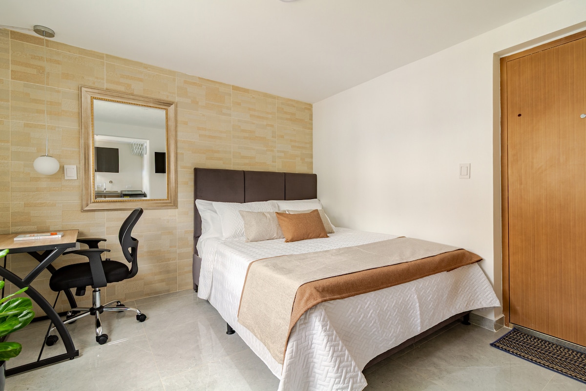 Լիովին կահավորված 28 քմ մակերեսով, օդորակիչով և խոհանոցիկով: Գտնվում է Մեդելինի լավագույն տարածքներից մեկում ՝ շատ հանգիստ թաղամասում, որը գտնվում է բոլոր տեսարժան վայրերի հարևանությամբ ։ Սյուիտից բացվում են քաղաքի և լեռների տպավորիչ տեսարաններ ։ Դուք կարող եք օգտվել աշխատավայրից, մարզասրահից և տպավորիչ սուրճից, որն առաջարկում է տարբեր տեսակի խմիչքներ ՝ հիմնված կոլումբիական լավագույն սուրճի վրա, կարող եք վայելել ձեր խմիչքը շենքի 2 - րդ հարկում գտնվող կտուրում: