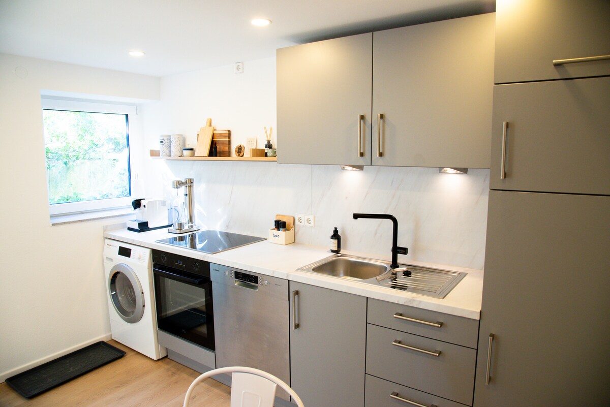Հարմարավետ հանգիստ Սև անտառի եզրին Բարի գալուստ մեր նորաոճ 87քմ մակերեսով բնակարան Niefern - Öschelbronn – ում ՝ կատարյալ հանգիստ մինչև 6 հոգու համար ։ Վայելեք հանգստանալու երեկոները լիովին կահավորված խոհանոցում ՝ հյուրասենյակում կամ հարմարավետ ժամեր ընդարձակ տեռասում կամ ընդհանուր խաղային երեկոներում: Հեռուստացույցով յուրաքանչյուր սենյակում, Wi - Fi - ով և Bluetooth ժամանցով ։ Երեք կայանատեղ ապահովում է առանց սթրեսի ժամանում ։ Զգացեք հանգիստ և հարմարավետություն հենց Հյուսիսային Սև անտառի դարպասի մոտ ։