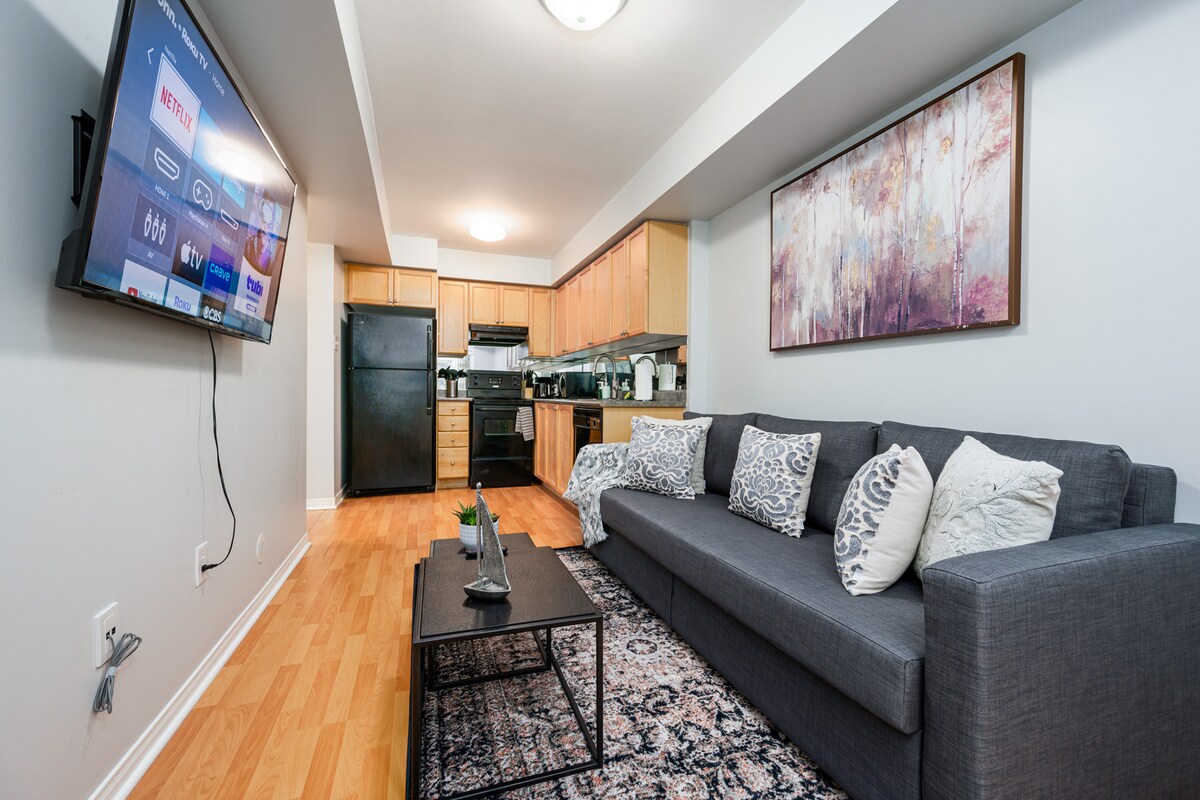 Բարի գալուստ այս ժամանակակից, բարդ և լիովին կահավորված 1 ննջասենյակով բնակարան, որը գտնվում է Միսսիսոգայի հրապարակ մեկ թաղամասի սրտում ։ Առանձնանում է 65 դյույմանոց հյուրասենյակի հեռուստացույց, ննջասենյակի հեռուստացույց, ամբողջական խոհանոց ՝ խոհանոցային պարագաներով և հիմնական պարագաներով, լվացքի մեքենա/չորանոց և արագ Wi - Fi ։ Վայելեք շենքի հարմարությունները, ինչպիսիք են մարզասրահը, անվտանգ FOB մուտքը, կայանատեղին, մթերային խանութը տեղում և ռեստորանների ու LCBO - ի մոտակայքը: Ընդամենը 15 րոպե մինչև Փիրսոնի օդանավակայան և 25 րոպե մինչև Տորոնտոյի կենտրոն ։ Կատարյալ է զույգերի և փոքր խմբերի համար ։