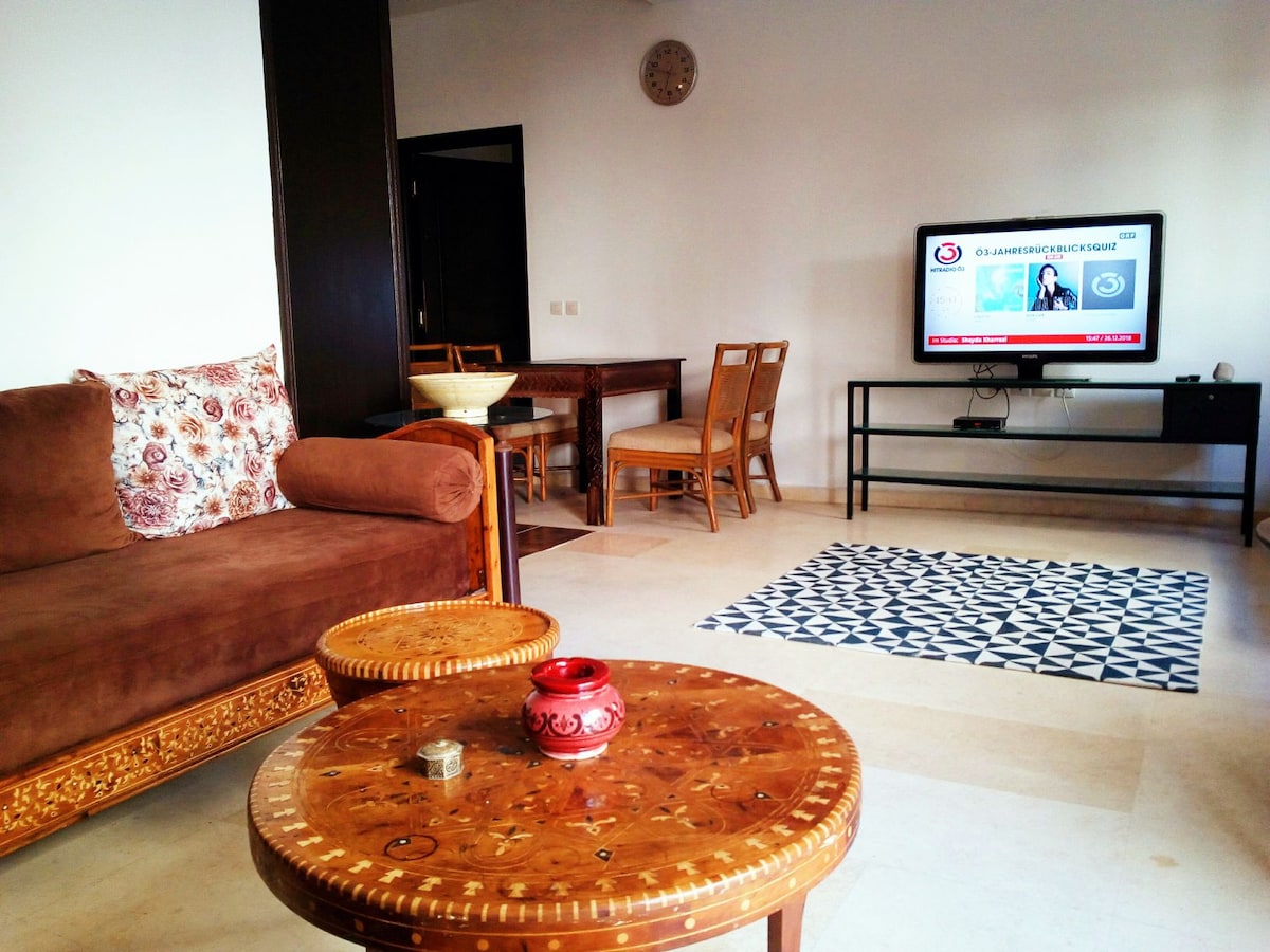 Գտնվում է հանգիստ տարածքում և գտնվում է Էսսաուիրա մեդինայի սրտում, որը մոտ է բոլոր խանութներին, սրճարաններին, ռեստորաններին, տաքսիներին և լողափերին: Լուսավոր և հարմարավետ բնակարան ՝ առանձին և կահավորված կտուրով: Հագեցած խոհանոց ՝ սառնարանով, տոստերով, էլեկտրական սրճեփով, թեյնիկով...., 2 հարմարավետ ննջասենյակ,սանհանգույց, երկու հյուրասենյակ: Շատ պայծառություն և բնավորություն : Մենք կարող ենք տեղավորել 4 - ից 5 մարդ, որտեղ 4 մեծահասակ և երկու երեխա: Իմ անունը Ֆաիկալ է: Ես ձեր տանտերն եմ, և դուք բարի գալուստ