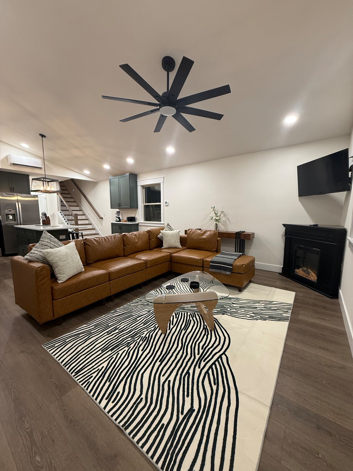 A rustic guest suite in the lower level of a log home. This open floor design features live edge tables, a large 75” screen tv with internet based channels, great wifi & an amazing view of the mountains & sunrises right outside your door! Your private deck has comfortable seating & a hot tub provided for your comfort. A Blackstone gas griddle is yours to use. A firepit with wood is provided! *Hosts do live upstairs, but the suite is sound insulated and noise from below has never been heard.