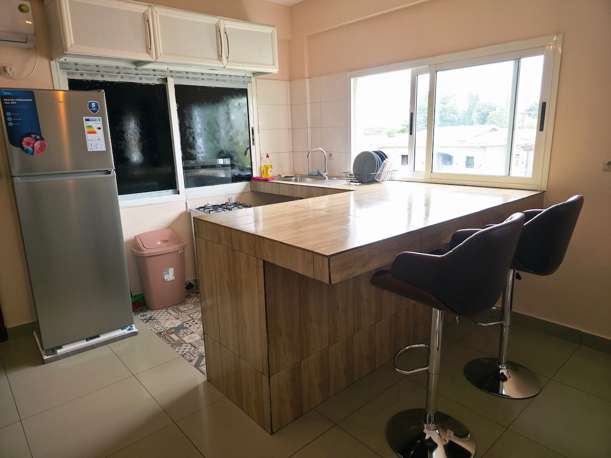 Séjournez dans ce magnifique et coquet appartement de deux chambres Cosy, Ht Standing, vue sur l'aéroport, bordure de route goudronnée. 2ème étage.Toutes commodités. 5à 7 minutes de l'aéroport. Deux min de la route de contournement. Cuisine moderne et complètement équipée. Mission de travail, Tourisme, escapade ou évasion. TV HD connectée. Wifi F.O. Grand parking. Sécurité. Gardien . Découvrez le, vous allez l'adorer. Comme à la maison simplement. Très bien aéré. Nous vous y attendons