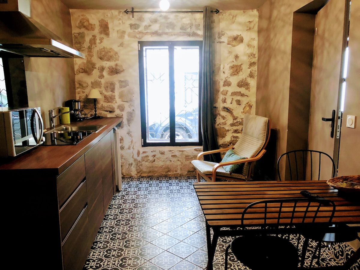 Dépendance 27m2 , facon suite parentale à côté de notre villa. piscine en partage avec la maison. Entree privee pas de mur mitoyen avec la villa Une terrasse avec table sous la pergola vous est réservée. linge de lit mis à votre disposition . Ce n’est pas un studio, donc il n y a pas de vraie cuisine ni evier. Cependant l’espace au fond est équipé d’un frigo/ congelateur, micro onde , machine à café, grille pain, vaisselle. Sucre, thé, capsules café à disposition.