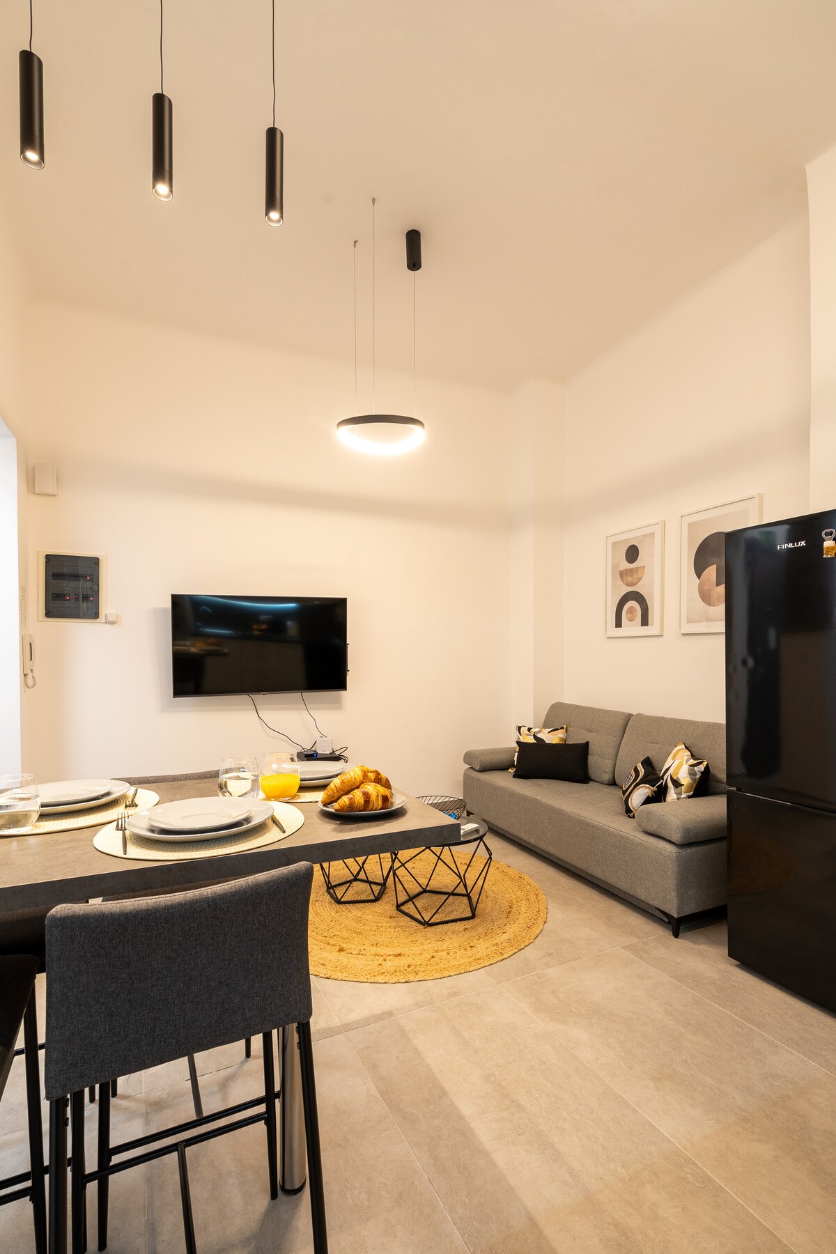 The apartment is located in the center of Piraeus and next to the port. Metro, airport connection, ferries, train, suburban train, bus station and tram all within 100 meters. Central location!! The apartment you are going to stay in is brand new and fully renovated with bedroom, kitchen, living room 69 square meters with high standards and designed by an excellent architect. Located on the 4th floor. It is comfortable and luxurious to make your stay unforgettable!