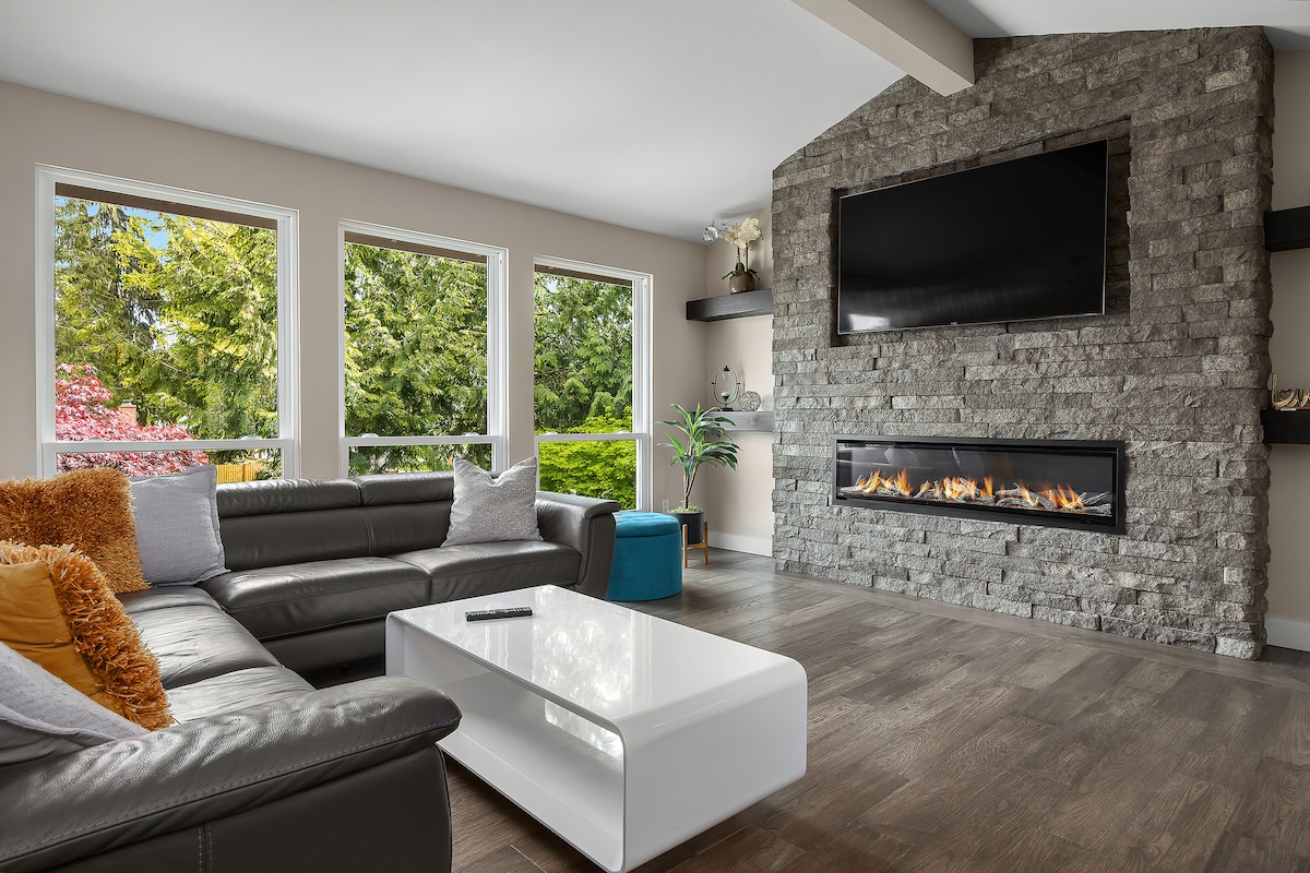 Առանձին 2 ննջասենյակով հանգիստ ՝ Սիեթլի հիասքանչ տեսարաններով, Space Needle - ով, լեռներով և ջրով ։ Վայելեք բացօթյա ինֆրակարմիր սաունա ։ Ընտանիքի համար հարմար և լիովին հագեցած արագ Wi - Fi - ով, խոհանոցով, հյուրասենյակով, լոգասենյակով, լվացքատունով և հարմարավետ բուխարիով ։ Ապակե պատշգամբով առանձին պատիո ՝ վայելելու հիանալի տեսարաններն ու շքեղ արևածագերը ։ Հանգիստ նրբաճաշակ թաղամաս ՝ դեպի Ալկի լողափ, զբոսանելի ռեստորաններ և ջրային տաքսիով դեպի Սիեթլի կենտրոն ։ Անվճար կայանատեղի տան դիմաց ։