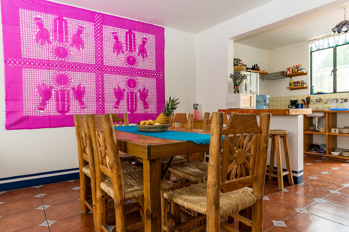 Ընդարձակ մեկ հարկանի տուն ՝ հաճելի պատիոով և նստատեղով ՝ սեղանով և փայտածուխով մանղալով ։ Երկու ննջասենյակ ՝ երկտեղանի մահճակալով, մեկը ՝ երկտեղանի և մեկտեղանի (առկա է լրացուցիչ ներքնակ )։ Նրանք ունեն պահարան, գրասեղան, սմարթ հեռուստացույց ։ Wi - Fi 100+ մբ ։ Կահավորված խոհանոց, սրճեփ, բլենդեր, հովացուցիչ, տոստերի ջեռոց և միկրո: Պլազա դել Սոլից 1 կմ հեռավորության վրա, Expo Guadalajara - ից 2.5 կմ հեռավորության վրա և բազմաթիվ ռեստորանների, բարերի, զբոսայգիների և սուպերմարկետների հարևանությամբ: