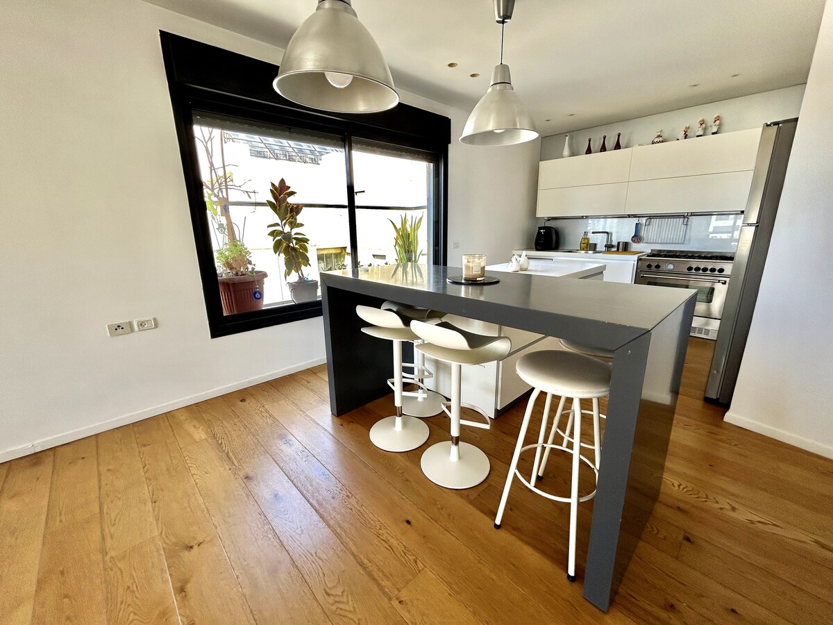 Զգացեք Թել Ավիվը վերևից Ցնցող պենտհաուս-լյուքս՝ Գիվաթայիմի կենտրոնում, 7-րդ հարկում, որտեղից բացվում է Թել Ավիվի երկնաքերերի գեղեցիկ համայնապատկերային տեսարան։ Վայելեք հիանալի վայրը՝ շրջապատված սրճարաններով, ռեստորաններով և խանութներով, որտեղից հասարակական տրանսպորտով հեշտ է հասնել Թել Ավիվի կենտրոն։ Նշում. Բնակարանը գտնվում է դուպլեքս տան վերին հարկում և լիովին մասնավոր է (հյուրընկալողները ապրում են ստորին հարկում), ինչը ապահովում է ձեր այցի լիակատար առանձնությունը և հանգիստը։ Հարմար է գործարար ուղևորների և հանգիստ քաղաքային հանգստի փնտրող զբոսաշրջիկների համար։