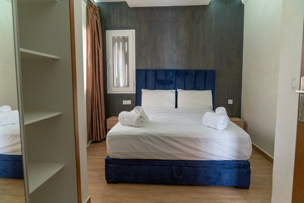 🌟 Suite Bleu Azur – Élégance Offrez-vous un séjour inoubliable dans l’unique suite de notre maison d’hôte Dar Laziza dans le quartier Nouinouich à Tanger, avec une magnifique vue sur la piscine et les espaces verts. Spacieuse et raffinée, elle est idéale pour les familles ou amis en quête de confort, d’indépendance et de sérénité. Nous sommes en soft opening, certains aménagements sont encore en cours et de légers travaux peuvent avoir lieu. Le service cuisinier n’est pas encore disponible.