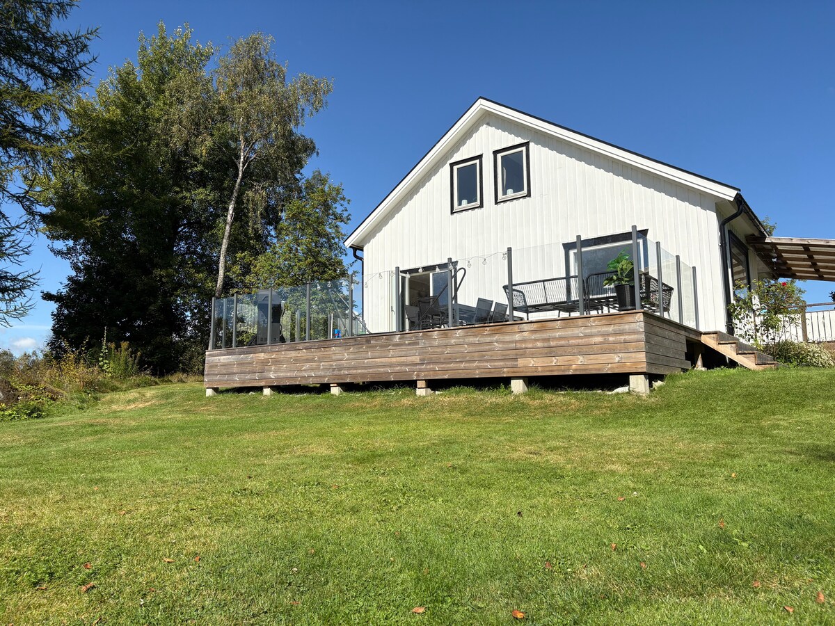 Koppla av i nybyggd villa på landet! Huset ligger på höjd i söderläge och har tre fina sovrum, var och ett med dubbelsäng. Det största sovrummet har även en våningssäng. Huset rymmer upp till 8 personer. Det finns litet SPA-bad, altan, kolgrill, Wi-Fi, AC i alla rum, TV och fri elbils-laddning Huset har ett separat WC, ett kaklat badrum, öppet kök/vardagsrum som härlig sällskapsyta med härlig braskamin samt tvättstuga. Inga fester, kick-off eller arbete/konferenser tillåtna.