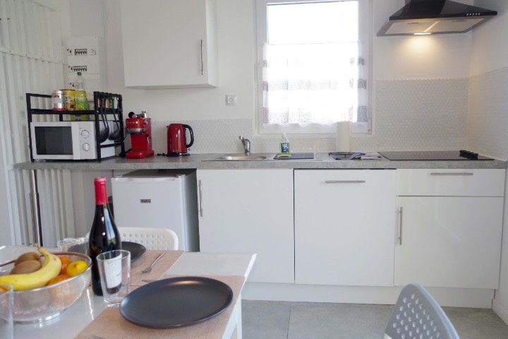 Détendez-vous dans ce logement calme et élégant. Un appartement confortable. A l’étage :une cuisine lumineuse ainsi qu’une salle de bain. Certes petite, elle a été pensée pour vous offrir un maximum de confort grâce à une baignoire balnéo spacieuse pour vous détendre en duo avec ses options jets/massages. Au rez de chaussée, un salon avec lit convertible et petite chambre attenante. Une baie vitrée vous apportera luminosité et vous offrira un accès sur un extérieur avec table .
