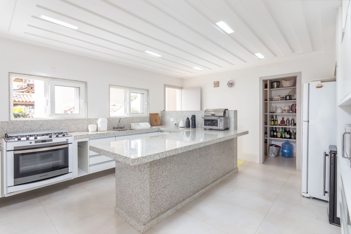 Beautiful house with swimming pool surrounded by native forest with swimming pool, ideal for relaxing and enjoying with the family, consisting of 3 bedrooms, 1 suite with dressing room on the upper floor with TV and two bedrooms on the ground floor, bathroom, living room/TV, kitchen American, barbecue area with pizza oven, balconies, hammock to relax.. It has quick and practical access to Ferradura beach, which is only 150.00 meters away. The house is fully equipped with bed and bath linen. WIFI