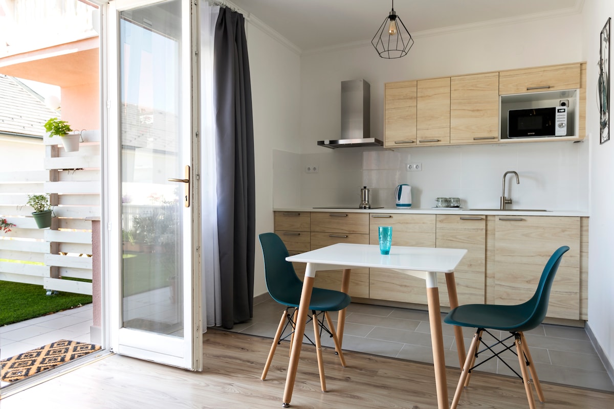 Élvezd a stílusos élményt ezen a központi szálláshelyen. Barátságos, kertre néző lakás lapozgatható könyvekkel. Jól felszerelt étkező-konyha beépített gáztűzhellyel, elektromos és mikrohullámú sütővel, mosogató és mosógéppel. Pároknak ideális elrendezés. Légkondicionált hálószoba. Városi strand és Fő tér 500 m, Festetics-kastély 1 km. Háziállat és dohányzás nem megengedett.