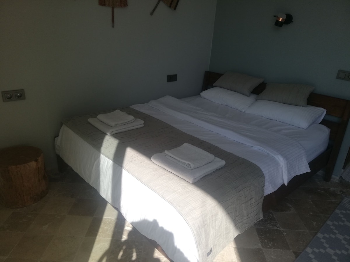 Our place is on Fethiye's famous Yergüzler Caddesi, 550 meters from Calis Beach. Our facility is a family business with 10 boutique style rooms. Every morning, we have an organic breakfast consisting of carefully selected products. Our rooms are as seen in the pictures. It has a small kitchenette. There is only tea and coffee in the kitchen. There is no mechanism for food and a mini fridge is available. Our priority is you. We care about both hygiene and our environment.