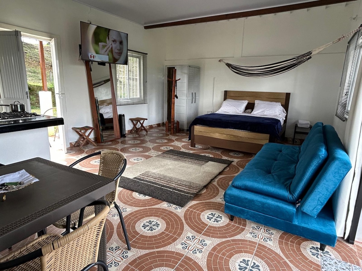 Nuestro Apartaestudio rural es una pieza artesanal, es un terruño, lugar perfecto con todas las comodidades para descansar alejado de la congestión, puedes atender tus compromisos digitales, espectacular vista del paisaje cultural cafetero, toma de nuestros árboles lsus deliciosos frutos como naranjas, guayabas, mandarinas, limones. Te podrás ejercitar recorriendo nuestro sendero ecológico. La vereda cuenta con transporte de Jeep Willys, transporte emblemático del Eje Cafetero.