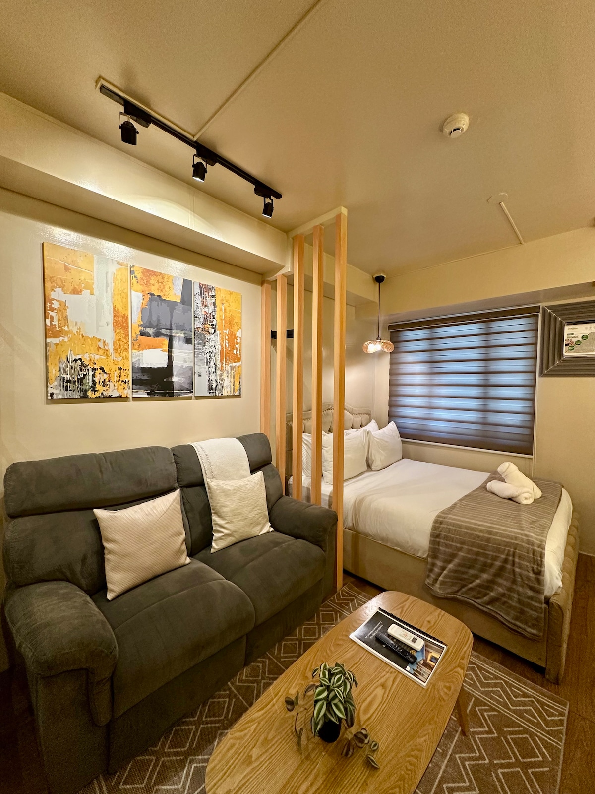 Welcome to Your Suite Escape—nestled right in the vibrant entertainment hub of Tomas Morato, Quezon City! Explore trendy cafés, indulge in local dining, or simply unwind after a long day with cozy movie nights on Disney+ and Netflix right in the comfort of your suite. Enjoy a thoughtfully designed studio with warm interiors, natural light, and hotel-style comforts. If this place is booked on your date, check out our other themed spot at airbnb.com/h/your-suite-escape-the-26th-at-tomas-morato