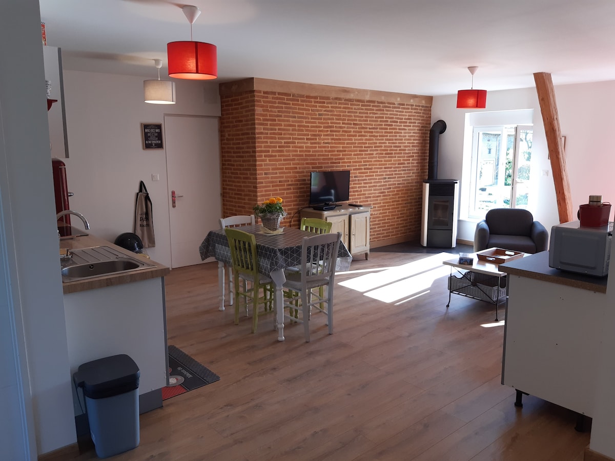 Gite - ը 100 մ² է: Ամբողջովին նոր է պատրաստված գոմում ։ Էլեկտրական ջեռուցում փայտի այրվող վառարանով: Լիովին կահավորված խոհանոց (սպասք լվացող մեքենա, սառնարան, սառցարան, ջեռոց + միկրոալիքային վառարան և այլն): Իդեալական է հանգստի և բնության հանգիստը վայելելու համար: Գտնվում է գյուղական վայրում ՝ առանց դրսի ։ Սեփականություն, որը պետք է համօգտագործվի սեփականատիրոջ հետ: մասնավոր տեռասային տարածք, մանղալ, ճոճանակ, սահարան: Անվճար WIFI: Netflix տուրիստական հարկի հավելավճար ՝ 1.21 / մեծահասակ/օր