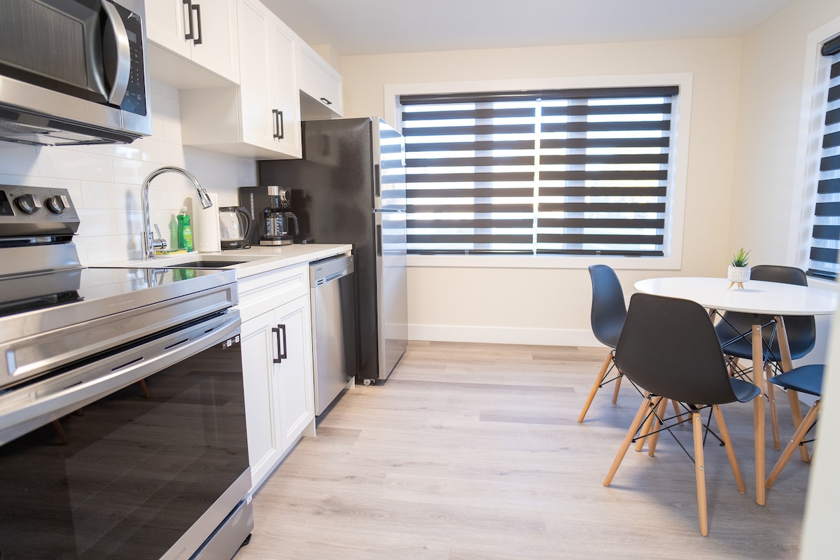 Quiet, freshly renovated lower unit apartment in a fourplex - 1 bedroom & 1 bathroom, - Self-check-in The space LIVING ROOM - TV with Netflix and YouTube BEDROOM - Queen bed KITCHEN - All the kitchen items required for cooking your favourite meal - Dining room table - Enjoy a complimentary hot cup of coffee or tea in the morning BATHROOM ‣ Marble tiled bathtub