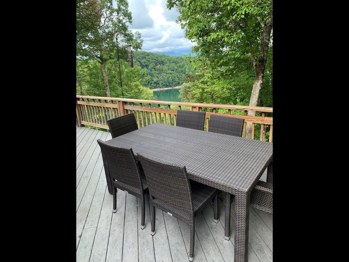 A truly unique cabin with a wall of windows giving you spectacular views of Fontana Lake and the Great Smokey Mountains National Park whether you are in the living room, kitchen, or dining room, or even upstairs playing pool. This cabin also has a long-paved driveway that is perfect for your cars or motorcycles. You can spend all your time relaxing at the cabin however, you are only 10 minutes to Tsali or the Nantahala Outdoor Center and only 15 minutes to Bryson City.