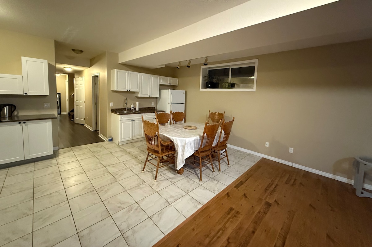 This modern basement apartment showcases the best use of small spaces with 2 bedrooms, 3 beds, 1 full bath, dining area, full kitchen and ample living room space. Separate entrance from the main house. This beautiful apartment comes with its own full kitchen, fridge, electric stove, Microwave, toaster, kettle, cookware, modern 3-piece washroom. It's own washer/dryer, queen beds, dresser, closet space, TV/Internet. *Companies are welcome to book. Please message via Airbnb messaging.