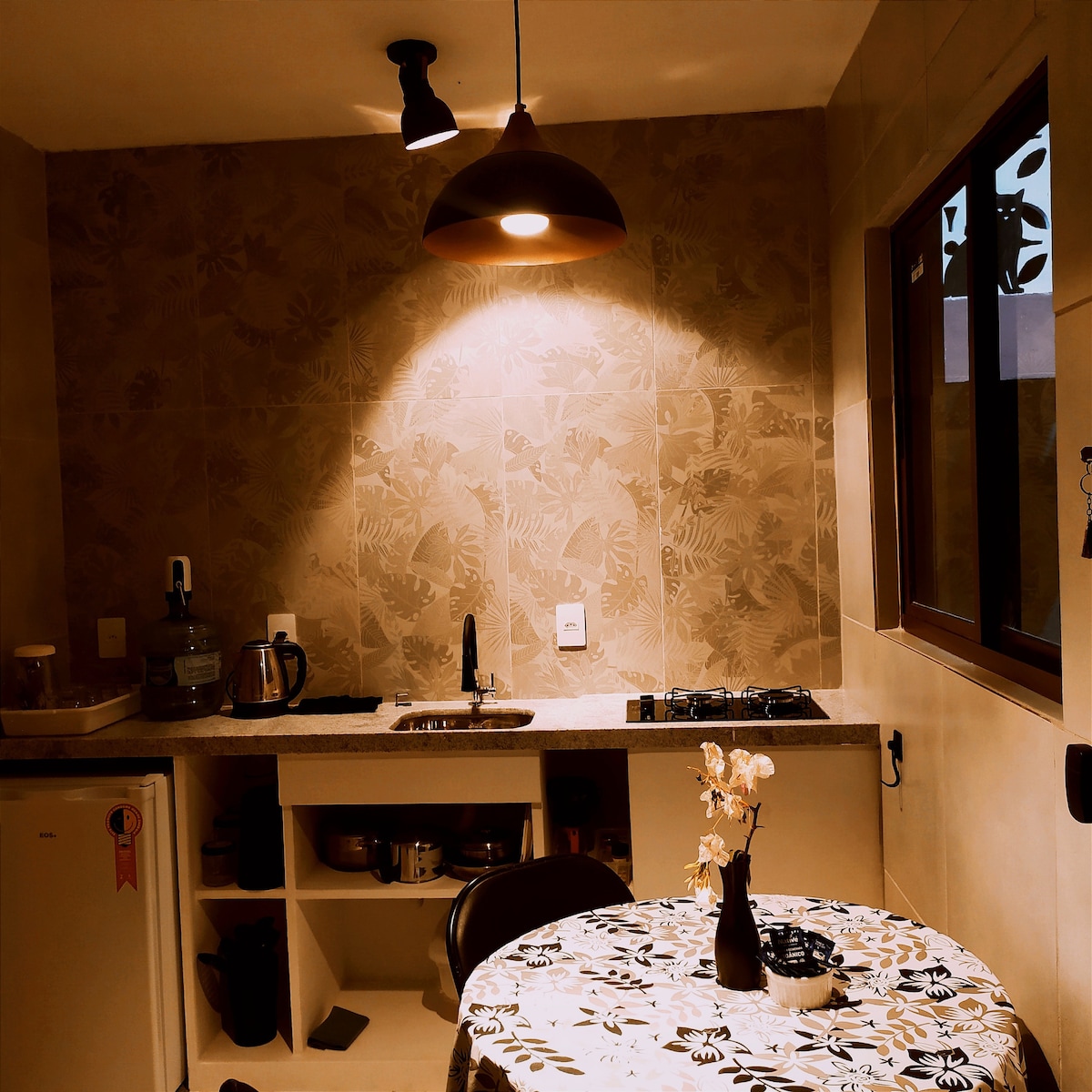 Apartamento privativo localizado no primeiro andar (acesso por escada), dentro da nossa casa, com total independência e conforto. Conta com banheiro completo, chuveiro, Smart TV e uma mini cozinha equipada com micro-ondas e frigobar. Para quem gosta de cozinhar, há um fogão disponível no deck externo. Ideal para quem busca praticidade, tranquilidade e um espaço aconchegante.