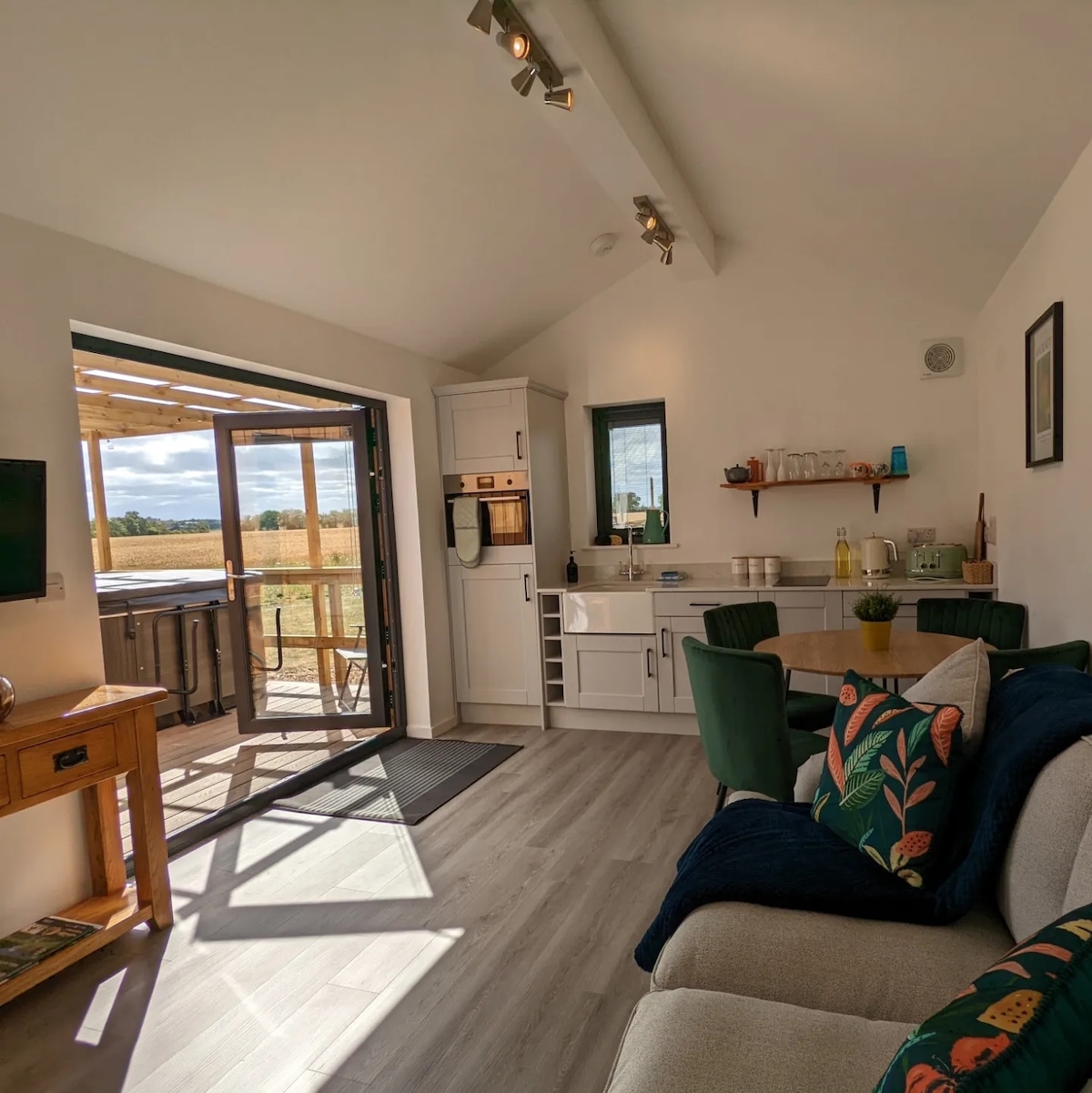 Շքեղ գլեմփինգի պատիճ ՝ առանձին ջակուզիով, որը տեղադրված է գեղեցիկ պարտեզի տարածքում ։ Յուրաքանչյուր պատիճ ապահովում է կատարյալ ռոմանտիկ հանգիստ այն զույգերի համար, որոնք հանգիստ են փնտրում ։ Միայն մեծահասակներ ։ Հարմարություններ և առանձնահատկություններ ՝ Freeview TV և DVD նվագարկիչ Խոհանոցի տարածք ՝ 2 օղակաձև էլեկտրական գազօջախով, միկրոալիքային վառարանով և սառնարանով Kingsize երկտեղանի մահճակալ Սեղանից և աթոռներից դուրս Տախտակամածով վերանդա ՝ պարտեզի կահույքով և խորովածով Ջակուզի 2 հոգու համար (առանձին) Սկիպսի լողափի և տեղական հարմարությունների մոտակայքում ։