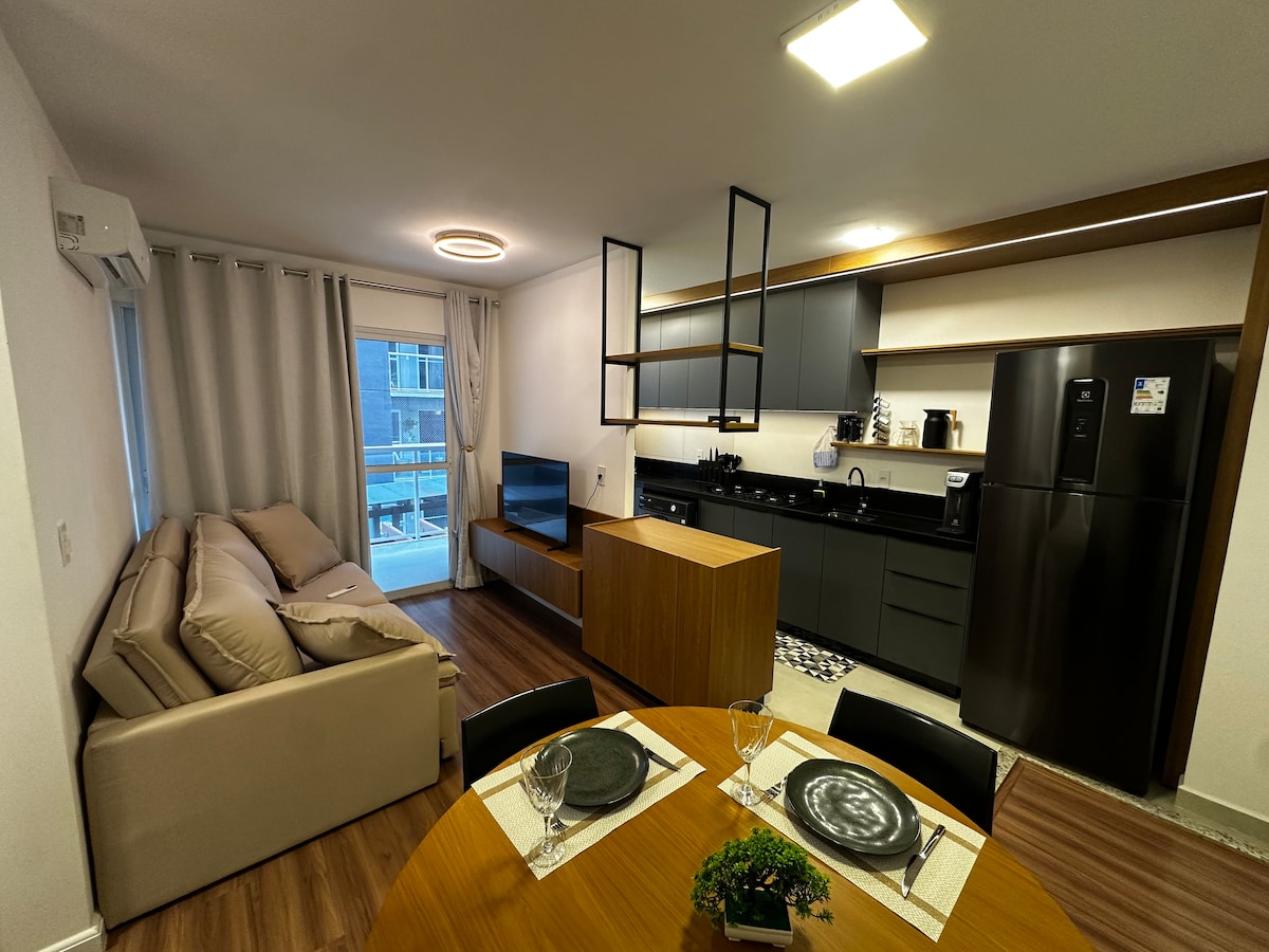 Apartamento novinho, moderno e totalmente mobiliado, com 2 quartos (1 suíte), ar-condicionado nos quartos e na sala, TVs smart, cozinha completa + churrasqueira. Localizado em uma das melhores regiões de Foz do Iguaçu, próximo à Av. das Cataratas, restaurantes, mercados e farmácias. Condomínio fechado com área comum de alto padrão, piscina, sauna, elevador e vaga de garagem. Um espaço pensado com carinho em cada detalhe para hóspedes que buscam conforto, segurança e uma experiência premium.