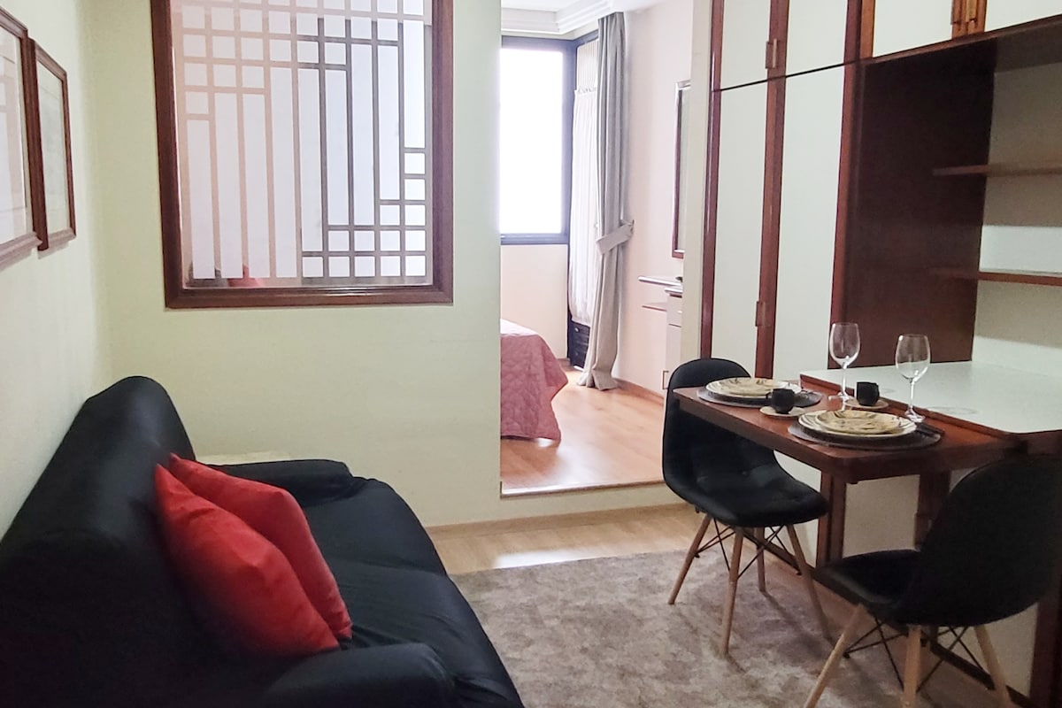 Stylish 50 m² apt. located at Bela Vista, has 24hr doorman. 2 bedrooms (only 1 with AC, and queen bed, the second one is quite small and can be used as an office, fitting a double-sized sofa-bed) and 1 bathroom. With amazing views from every window, it is a great place to work and relax. The private jet-tube at the balcony is a fantastic spot to enjoy the city views. Ideal for couples, professionals or small families looking for comfort, convenience, and one of the best views in the city.