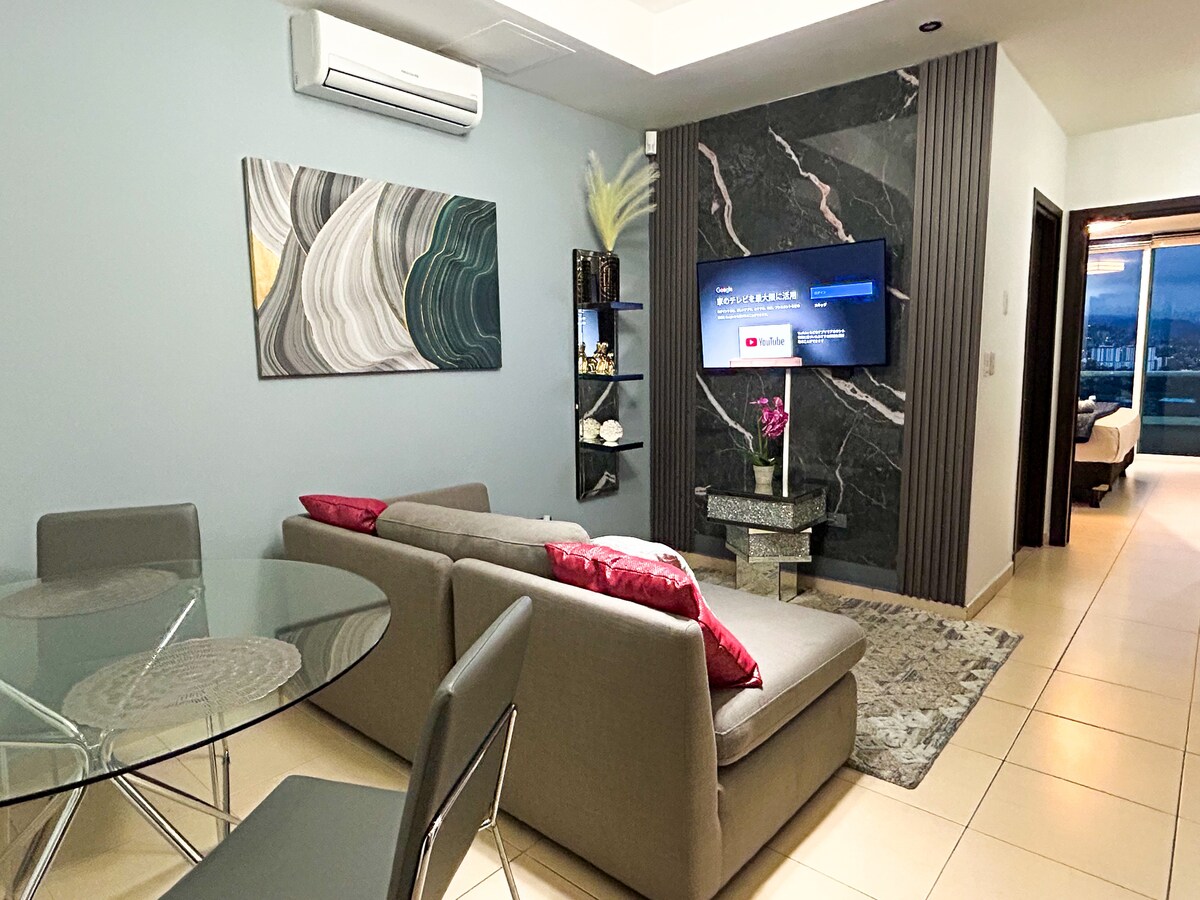 • Furnished terrace + complimentary coffee to unwind • Luxurious and safe apartment • 15 minutes from the U.S. Embassy • 2 bedrooms, each with a private bathroom, blackout curtains, and A/C • Fully equipped kitchen • Free washer and dryer • 3 Smart TVs with Netflix • Ideal location: walk to Multiplaza Mall, banks, and restaurants • Perfect for 4 guests (up to 5: 1 on the sofa) • Pets welcome!