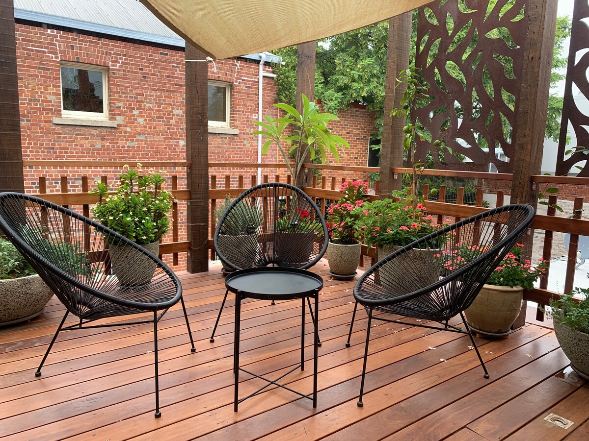 Immaculately presented & beautifully decorated 5 star light filled apartment located right in the exciting centre of Freo. This true gem offers you a personal parking bay, super comfortable king size bed & private alfresco plant filled garden deck ! A delightful heritage converted warehouse, it will be a joy for you to come home. Perfect for one or two guests, it offers a welcoming home for anyone travelling on business or on vacation. A green retreat to unwind & enjoy a peaceful Freo sojourn.