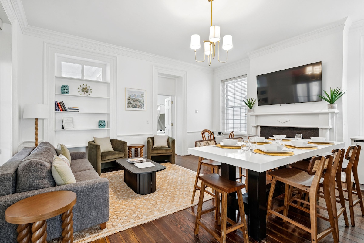 Turn back time in this refined historic Charleston residence (OP2025-06356). Soaring 12-ft ceilings, polished wood floors, and grand sash windows set the tone for an elegant retreat. A master bedroom and curtained sunroom each offer king beds for flexible sleeping. Located in a quiet, walkable historic downtown neighborhood. Perfect for couples or a sophisticated girls’ weekend. Private entrance, thoughtfully designed 1,000 sq. ft. interior. Exclusive off-street parking with EV charger.