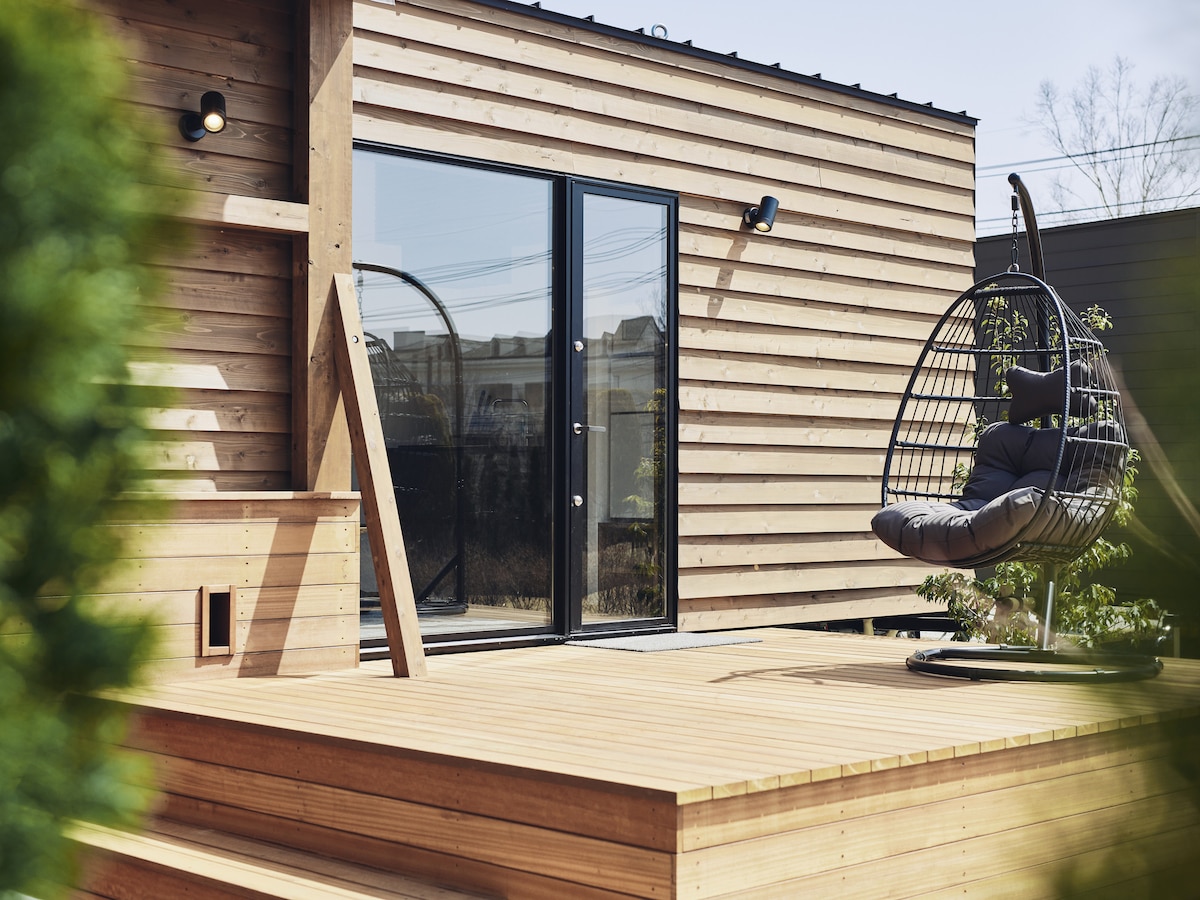 1日1組限定 プライベートドッグガーデン付きアメリカントレーラーハウス!屋外ウッドデッキでBBQ
