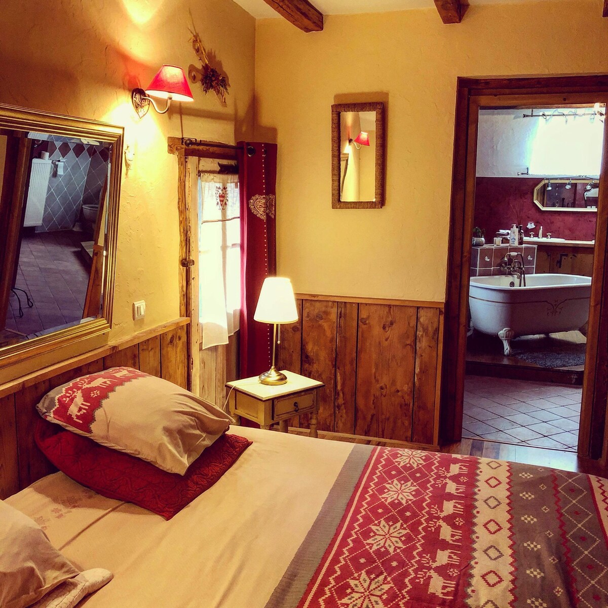 Երկու սենյակ Վերին Սավոյեում վերանորոգված ֆերմայի առաջին հարկում ։ Երկու սենյակներն էլ ապահովված են երկտեղանի մահճակալով ։ Նրբաճաշակ լոգասենյակը ընդհանուր է երկու սենյակների միջև: Տունը շրջապատված է անտառներով և դաշտերով ։ Տեսարան դեպի Մոն - Բլան պարտեզում ։ Կա ամառային խոհանոց ՝ սառնարանով, գազօջախով/պլանչայով, լվացարանով, մանղալով, սպասքով, հիմնական խոհանոցային պարագաներով ։