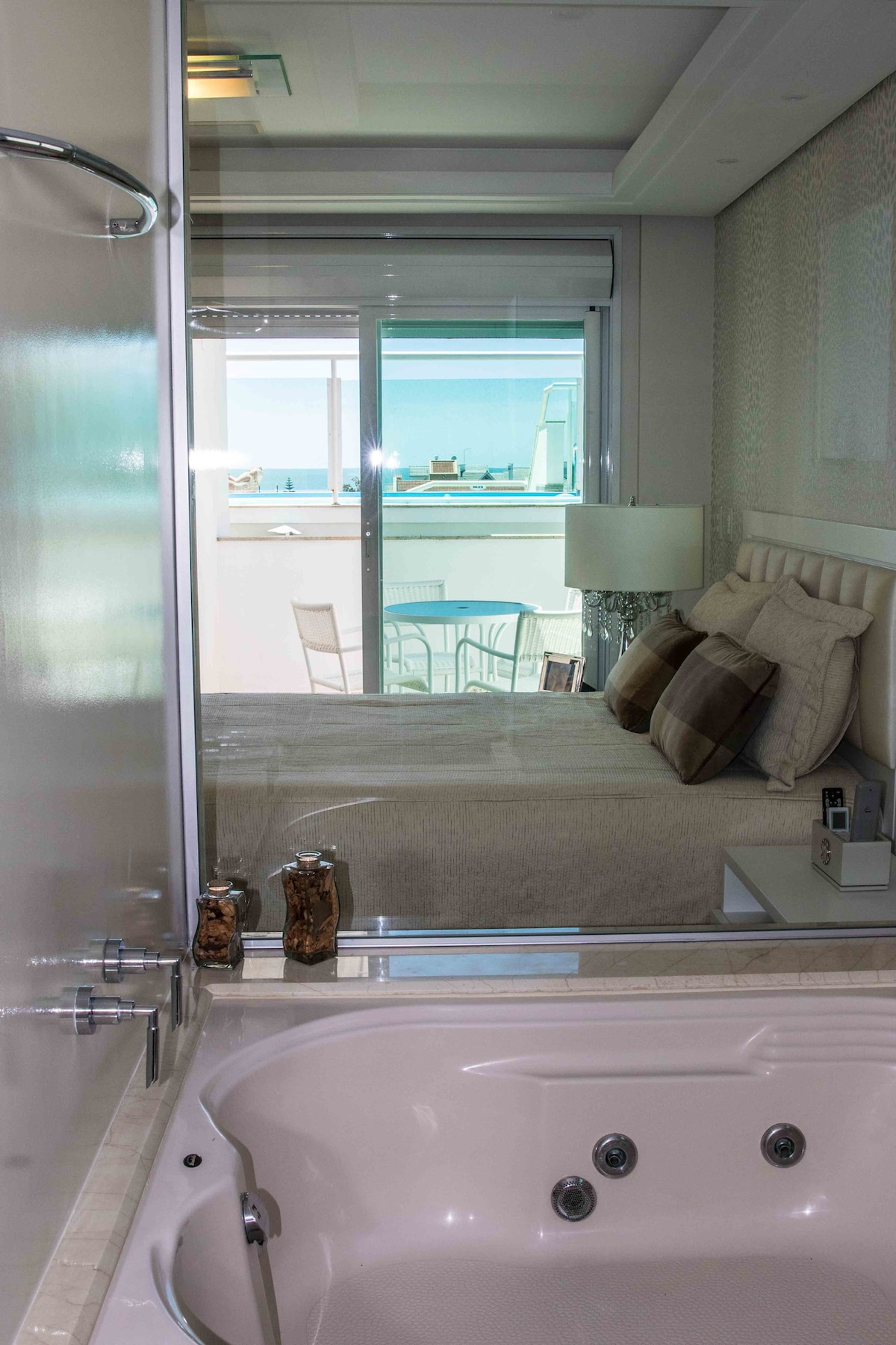Մնացեք Jurerê - ի (Florianópolis, SC) գեղեցիկ ծովում, ամերիկյան խոհանոցով, երկտեղանոց մահճակալով, Split օդորակիչով, LED 40"Cable SmarTV - ով Youtube - ով և Netflix - ով, մինիբար, գազօջախ, միկրոալիքային վառարան, տաք լոգարան և մեծ պատշգամբ ՝ ծովի տեսարանով: