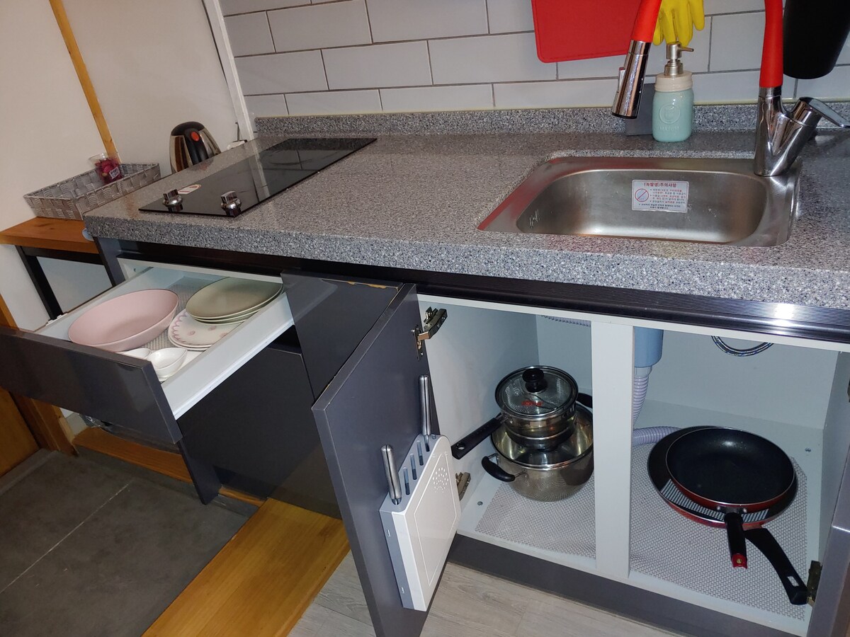 Դա մասնավոր շենք է, որը գտնվում է Գյոմբյոնսան բլրի վրա՝ Kim Yu-jeong Munhak գյուղի հետևում, որտեղ մեկ խումբ կարող է ամբողջությամբ վայելել պարտեզը և կացարանը մեկ օրվա ընթացքում։ Մենք տրամադրում ենք 100% բամբակյա սպիտակեղեն և արևի լույսի հոտով լցված, եռացված սրբիչներ՝ ամեն անգամ, երբ լվացք եք անում։ Այն լուսավոր տարածք է, որտեղ արևի լույսը ներթափանցում է մեծ պատուհանով։ Սա ստուդիայի տեսակի բնակարան է՝ երկու առանձին մահճակալներով, որոնք տեղադրված են կողք կողքի, այնպես որ հիմնականում նախատեսված է 2 մեծահասակի համար, և կարող են տրամադրվել լրացուցիչ մահճակալներ մինչև 4 անձի համար, և կարող են մուտք գործել մինչև 4 անձ, այդ թվում՝ մանուկներ։ Մինչև 2 տարի (մինչև 24 ամիս) անվճար է, և լրացուցիչ անկողնային պարագաներ չեն տրամադրվում, եթե անվճար է։ Կարող եք տեսնել Սամաքսան լեռը, իսկ եթե եղանակը լավ է, կարող եք տեսնել գեղեցիկ մայրամուտը՝ լի կարմիր լույսով։ Մենք նախաճաշ ենք տրամադրում վճարովի (5000 վոն/անձ, 3000 վոն՝ տարրական դպրոցի աշակերտների համար/անձ, բրանչ՝ հաջորդական գիշերների համար և այլն)։ Եթե ցանկանում եք, խնդրում ենք պատվիրել նախապես։ Մենք խորովածի ծառայություն չենք տրամադրում։ Մեր կացարանում խոհանոց չկա, այնպես որ չեք կարող կերակուրներ պատրաստել։ Կարող եք օգտվել միկրոալիքային վառարանից և սրճեփից։
