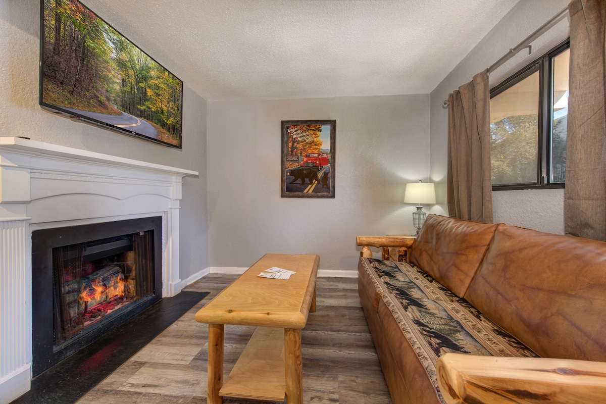 Experience the charm of this beautifully redesigned condo perched just above the heart of Downtown Gatlinburg—yet within easy walking distance! Enjoy a luxurious king bed with ensuite bath, kitchenette, two TVs, Wi-Fi and a cozy living space with fireplace. Relax by the fire, sip coffee on the private balcony, take a refreshing swim or explore the Smokies - the choice is yours! And shhh....don't forget our private “secret” staircase leading to downtown, saving time, hassle and parking fees!